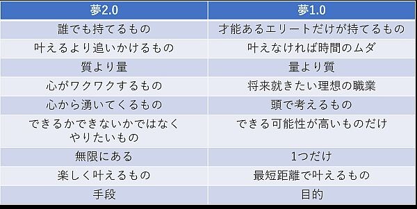 同書では、この旧態依然とした夢の定義を「夢 1.0」と呼び、「今日ラーメンが食べたい」「新しくできたあのお店に行ってみたい」といった「心がワクワクするものすべて」を「夢2.0」と定義している。