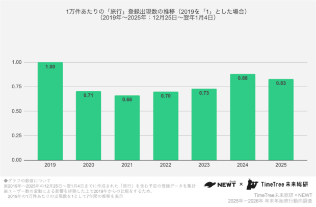 TimeTreeに登録された予定データから、2019年以降7年間における年末年始(12月25日~翌年1月4日)の「旅行」予定の推移を分析した結果、2025年の年末年始の旅行予定登録数は2019年比で83%となりました。一時期はコロナ禍の影響で大きく減少しましたが、2022年以降は回復基調に転じ、2023年73%、2024年88%と上昇を続けてきました。2025年は前年を5ポイント下回ったものの、コロナ前の8割超の水準を維持しており、回復基調は継続しています。一方で、物価高や宿泊費の上昇を背景に、日本人の旅行需要の伸びはやや鈍化しつつあるようです。
