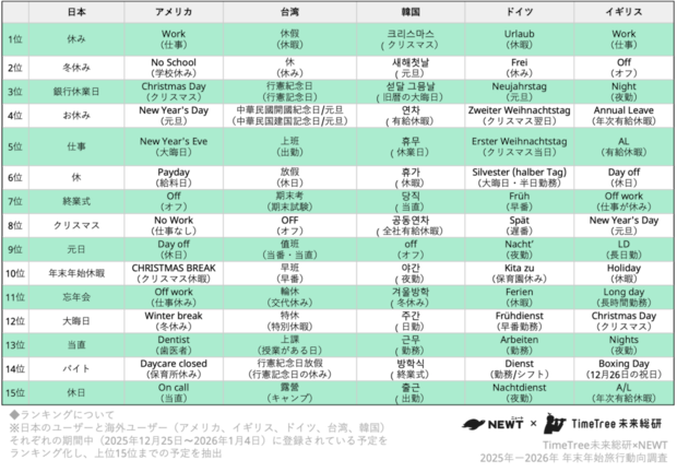 今回の調査で最もユニークだったのは、世界6カ国の年末年始の予定ワードを比べると、日本だけが「銀行休業日」を予定に入れているという点。年末年始に銀行が一斉休業する日本ならではの習慣と、現金文化の根強さが予定データにも表れています。アメリカやイギリスでは年末年始でも「Work(仕事)」が上位に登場し、台湾や韓国では学校行事が目立つなど、各国の文化や生活の違いが鮮やかに浮かび上がりました。