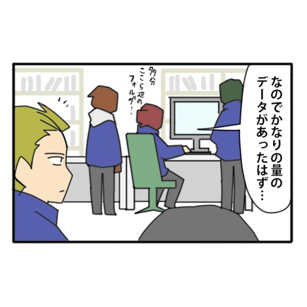 データの格納場所を探す社員。そこへ課長もやって来て、先輩さんに何があったのかをたずねます。そのタイミングで、過去のデータが発見されました。