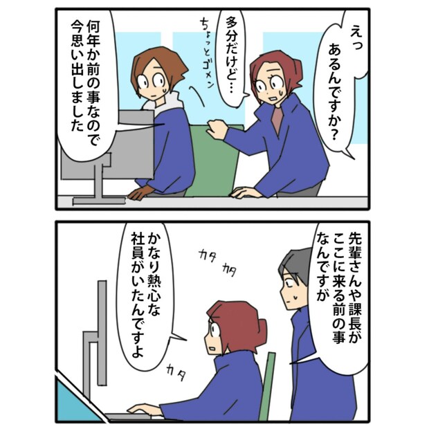 支社に長く勤めている社員が、過去のできごとを思い出します。どうやら、課長や先輩さんが来る前のことのようですね。