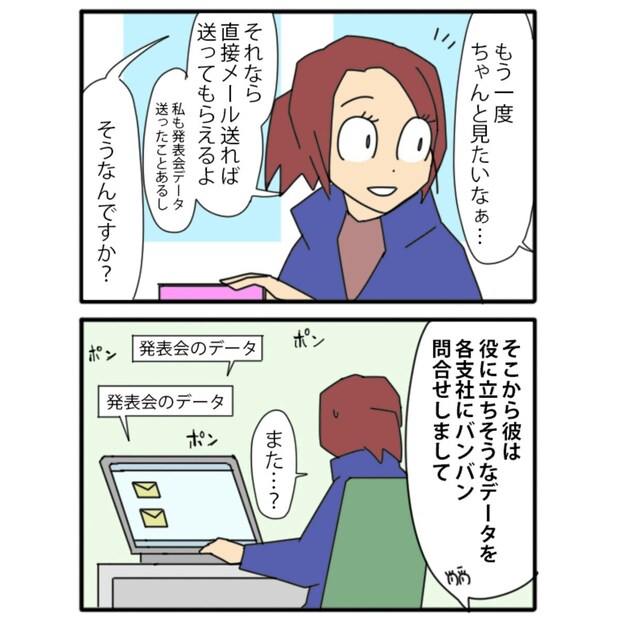 現場責任者の社員は、長くこの支社にいるため、過去に所属していた熱心な社員の存在を知っていました。その記憶を頼りに、熱心な社員が他の支社からもらった発表会のデータを発見します。