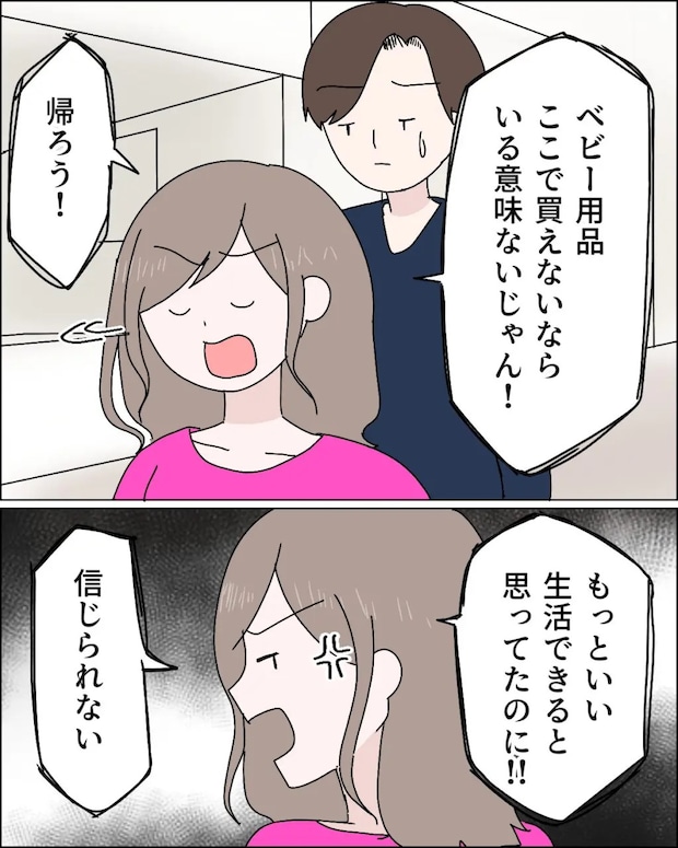 「ベビー用品ここで買えないならいる意味ないじゃん!帰ろう!」そう言った後、「もっといい生活できると思ってたのに!!信じられない」と言い捨てるように言いました。