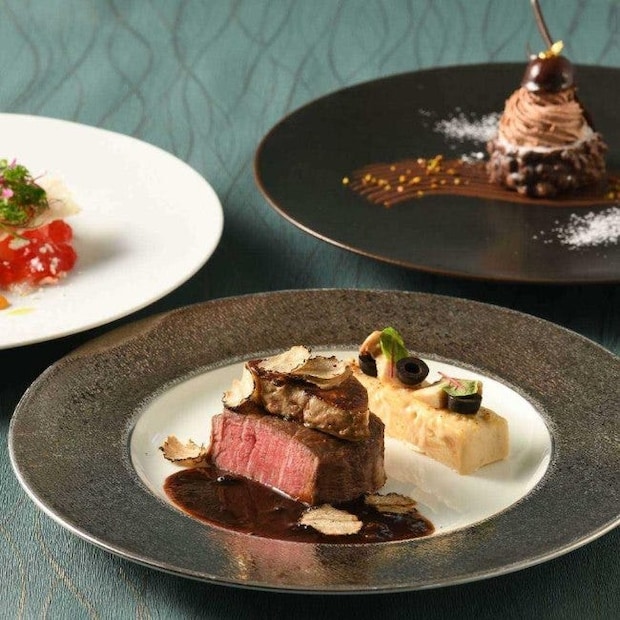 GINZA SIX最上階にある「THE GRAND 47」は、シャンデリア輝く気品あふれる空間がお出迎え。ガラス越しに銀座の街を見下ろしながら、日本中の“おいしい”を集めたフレンチをフルコースでいただける。見た目も麗しい前菜は、椿姫のミキュイと甘鯛の鱗焼きの2皿。オマール海老のローストに続く、肉料理には厳選黒毛和牛にトリュフのソースを合わせて贅沢に仕上げられた。クリスマスらしいブッシュドノエルを再構築したデザートも、このときだけのお楽しみ。