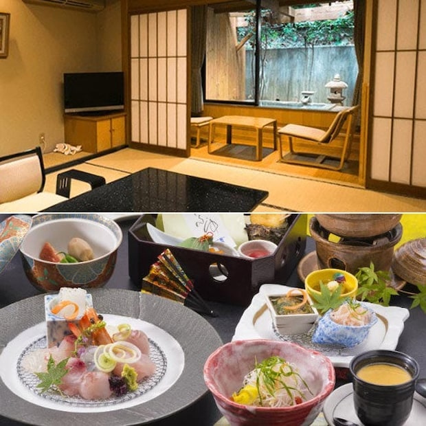 上/露天風呂付和室10帖のお部屋。湯船には湯量豊富な温泉がこんこんと注がれる 下/夕食には伊豆近海の海の幸が次々に登場