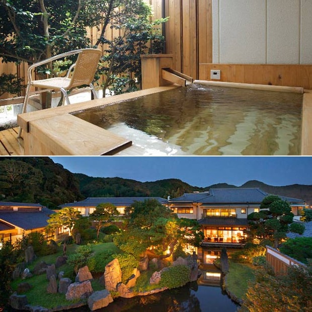 上/ベッドルーム和洋室(Cタイプ)の専用露天風呂は檜造り。2人で入っても十分な広さ 下/300坪の広さを誇る美しい日本庭園