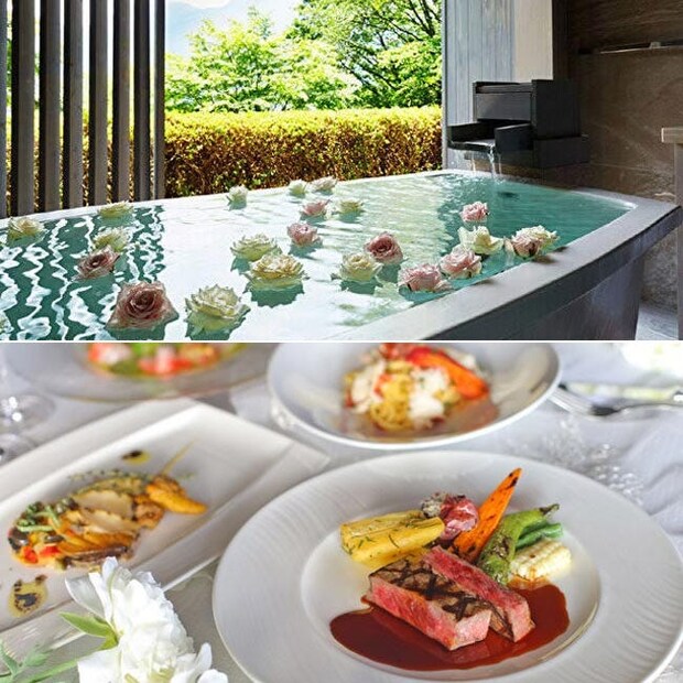 強羅の山並みを一望する高台に立つ、全14室のプチホテル。自然に囲まれた隠れ家のような邸宅で、静かに過ごしたい大人のカップルにおすすめ。男女別大浴場の半露天風呂では、雄大な箱根内輪山を眺めながらのびのびと湯浴みが楽しめる。露天風呂付き客室はモデレートダブルや角部屋のスーペリアツイン、最上階のデラックスツインなど。2人でゆったり入れる広めの浴槽には強羅温泉の源泉がかけ流しで注がれており、保湿効果が高いという温泉に好きなだけ浸かれる。半露天風呂ながら窓が全開方式なので開放感もばっちり。
