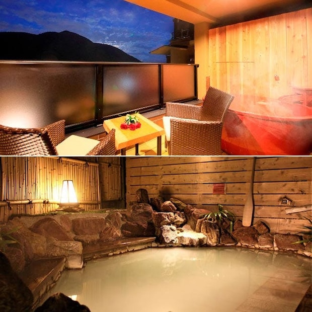 上/本館の露天風呂付き和室。露天風呂には酸化還元水を使用 下/大浴場の露天風呂は大涌谷温泉を源泉かけ流し。にごり湯が温泉風情たっぷり