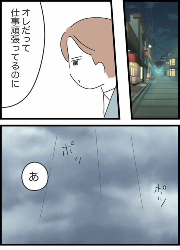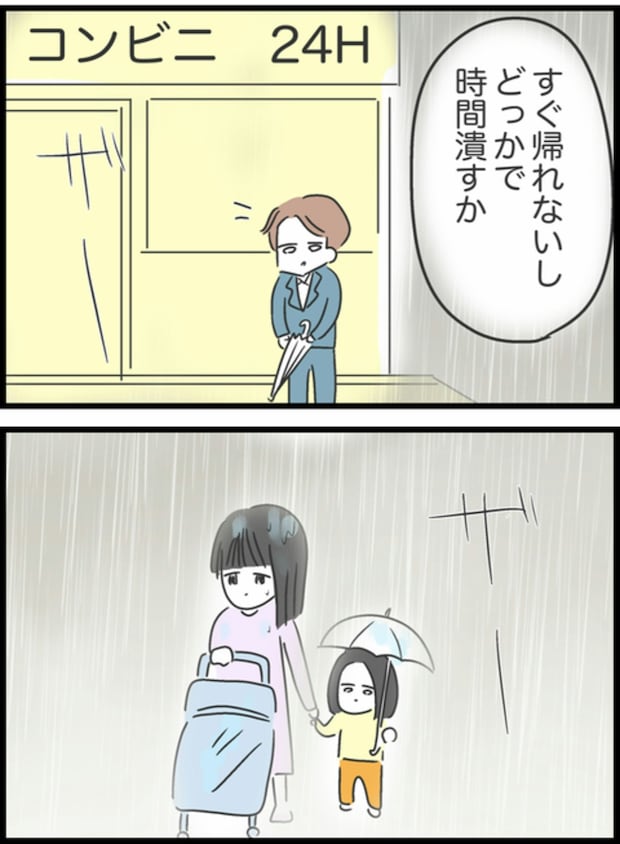 「オレだって仕事頑張ってるのに」とつぶやくしょうた。どこかで時間をつぶそうと考えていたところに、雨の中、ベビーカーを押しながら子どもと手をつなぐ母親に遭遇し…。