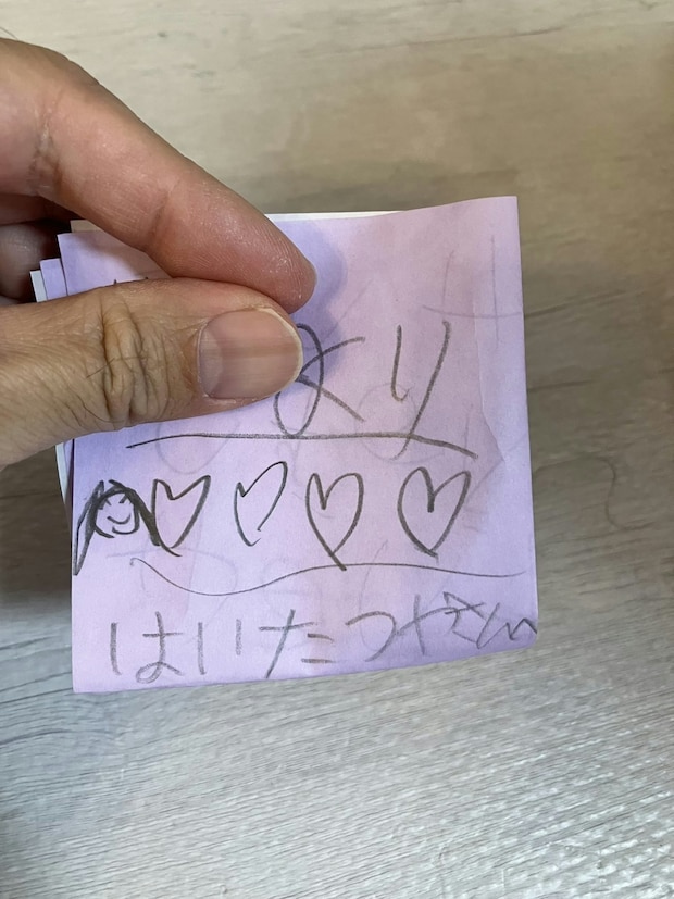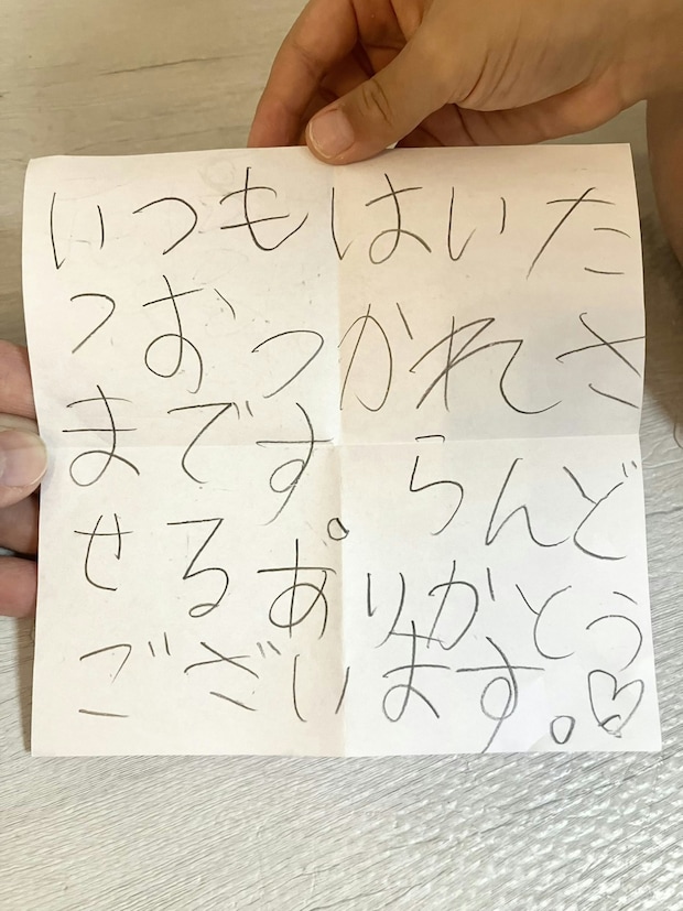 配達員さんへ宛てたメッセージ。配達員さんへの「ありがとうのお手紙」、とてもすてきですよね。一文字一文字に「うれしい」「楽しみ」があふれていて、心がほんわかしますね。勇気を出してドアの前で待つ姿を想像するだけで胸がぎゅっとします。「届くもの」は待ちに待ったランドセル。そして配達員さんが娘さんに手渡されるのはきっとそれ以上の喜びがありそうです。