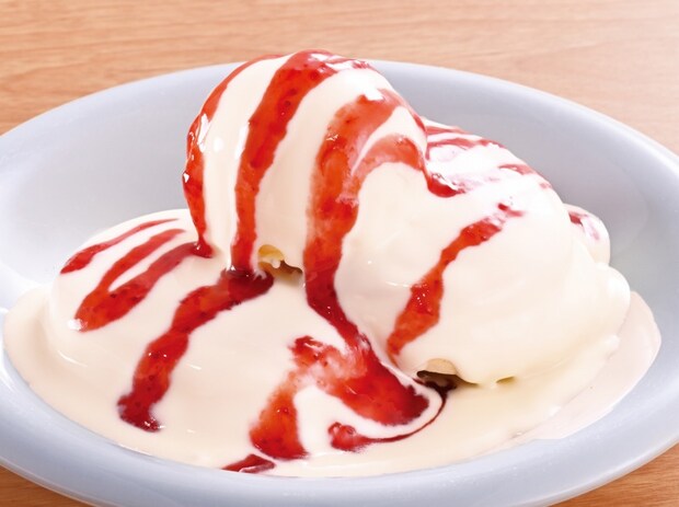 “ストロベリー”の濃厚ソースとふんわりパンケーキを合わせた大人のデザート。食後でもぺろりといける“背徳スイーツ”。