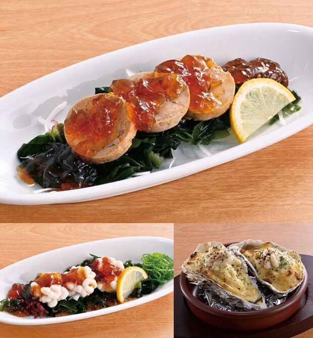 (上→左下→右下)ジュレぽん酢de食べるあん肝、ジュレぽん酢de食べる真鱈白子、真鱈白子とあん肝クリームソースの濃厚グラタン