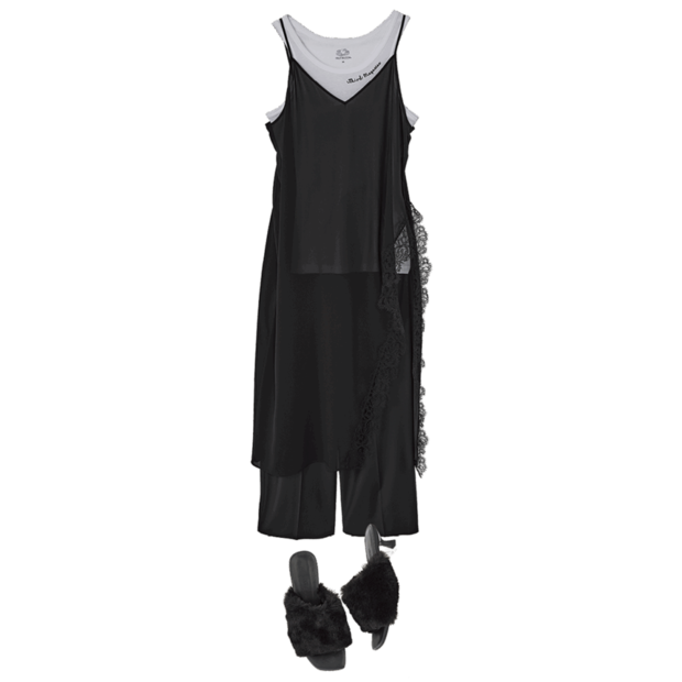 ドレス¥79,200(サヴィル サヴィ)、タンクトップ¥7,700※2枚セット(サードマガジン×フルーツオブザルーム/サードマガジン)、パンツ¥39,600(マルティニーク/マルティニーク ルミネ横浜)、シューズ¥31,900(ペリーコ サニー/アマン)