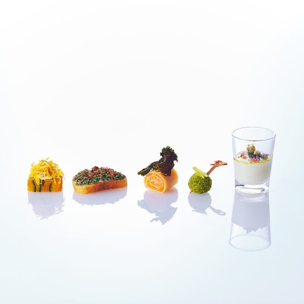 左から「パンプキンブレッセ」、「トリュフオーブンサンドイッチ」、「サステナブルサーモンクレープ」、「ズワイガニとポルチーニクリーム」、「アキテーヌ産キャビア」