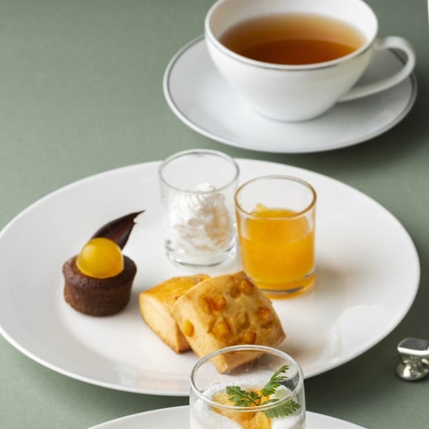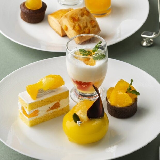 甘酸っぱい柑橘の香りとともに楽しめる全6種のスイーツ。グランマルニエを効かせたカスタードとジューシーな柑橘を合わせた「柑橘タルト」や、メロンといちご入りのジュレ、ブランマンジェを重ねたグラスデザート「柑橘ブランマンジェ」のほか、不知火(しらぬい)の爽やかな苦みととろりとしたジュレを閉じ込めたなめらかな「柑橘ムース」、しっとりしたスポンジ生地とシャンティーに柑橘が香る「柑橘ショートケーキ」など、多彩な柑橘の魅力を存分に堪能できるスイーツが勢揃い。「柑橘フィナンシェ」は、チョコレートフィナンシェにジューシーな柑橘のパート・ド・フリュイを合わせた逸品。