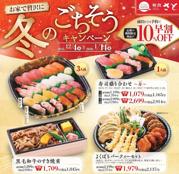 国内199店舗を展開する「和食さと」は、2025年12月4日から2026年1月14日までの間、年末年始のテイクアウトメニューを販売する。