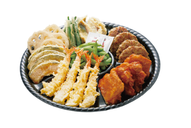 海老天・さとチキ・ハンバーグ・アジ天または季節の魚天・野菜天3種・枝豆