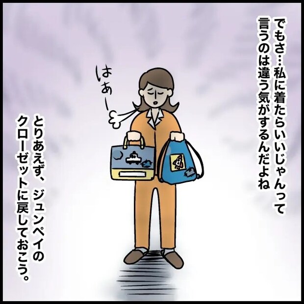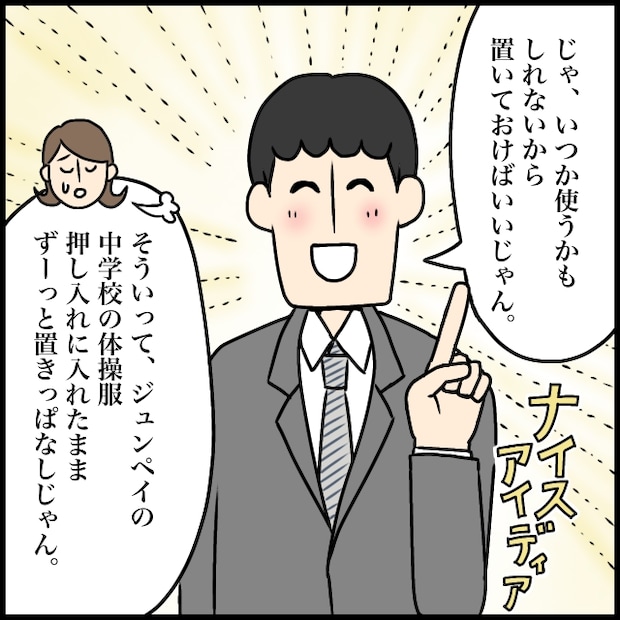 私が「自分が使わなかったものを子どもたちに使わせるの?」と聞くと、ジュンペイは「じゃあ、いつか使うかもしれないから置いておけばいいじゃん」とまるで名案とばかりに言いました。その言葉に私はため息をついて「そう言って、ジュンペイの中学校の体操服、押し入れに入れたままじゃん」と返します。