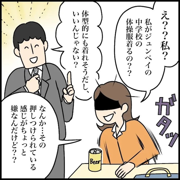 「え?私がジュンペイの中学校の体操服着るの?」驚きのあまり、私は思わず身を乗り出しました。「体系的にも着れそうだし、いいんじゃない?」笑顔で話すジュンペイに、「押し付けられている感じがちょっと嫌なんだけど?」と顔を引きつらせながら言います。