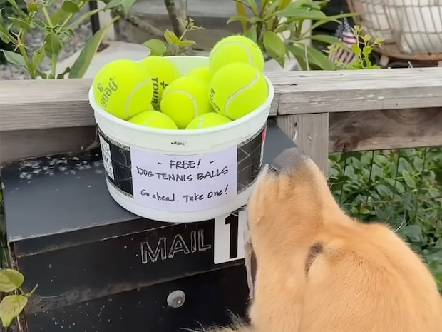 「無料! 犬用テニスボールどうぞ。1つ持っていってね!」