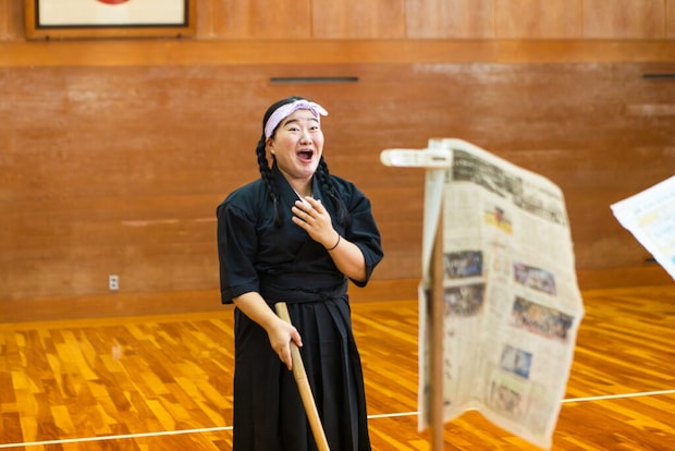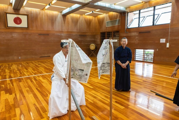 体験で挑戦するのは、木刀で新聞紙を切ること。