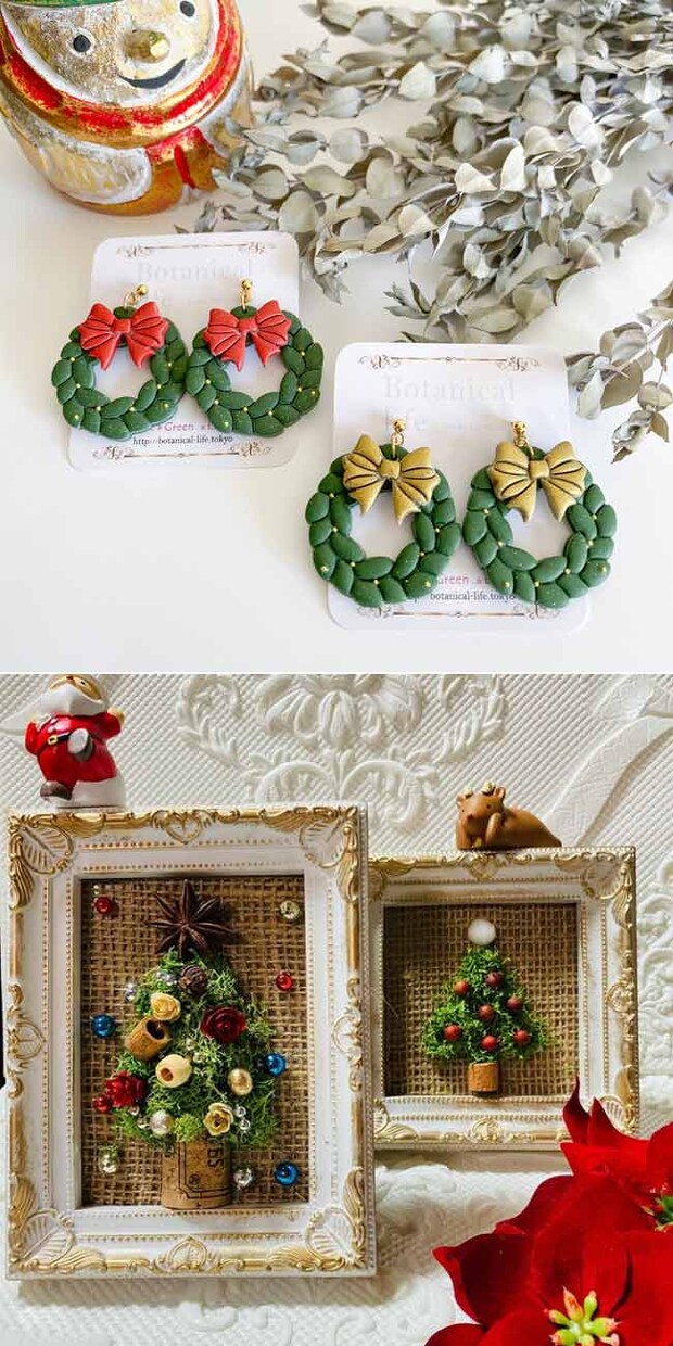 上/リース(ピアス&イヤリング)、下/クリスマスツリーフレーム