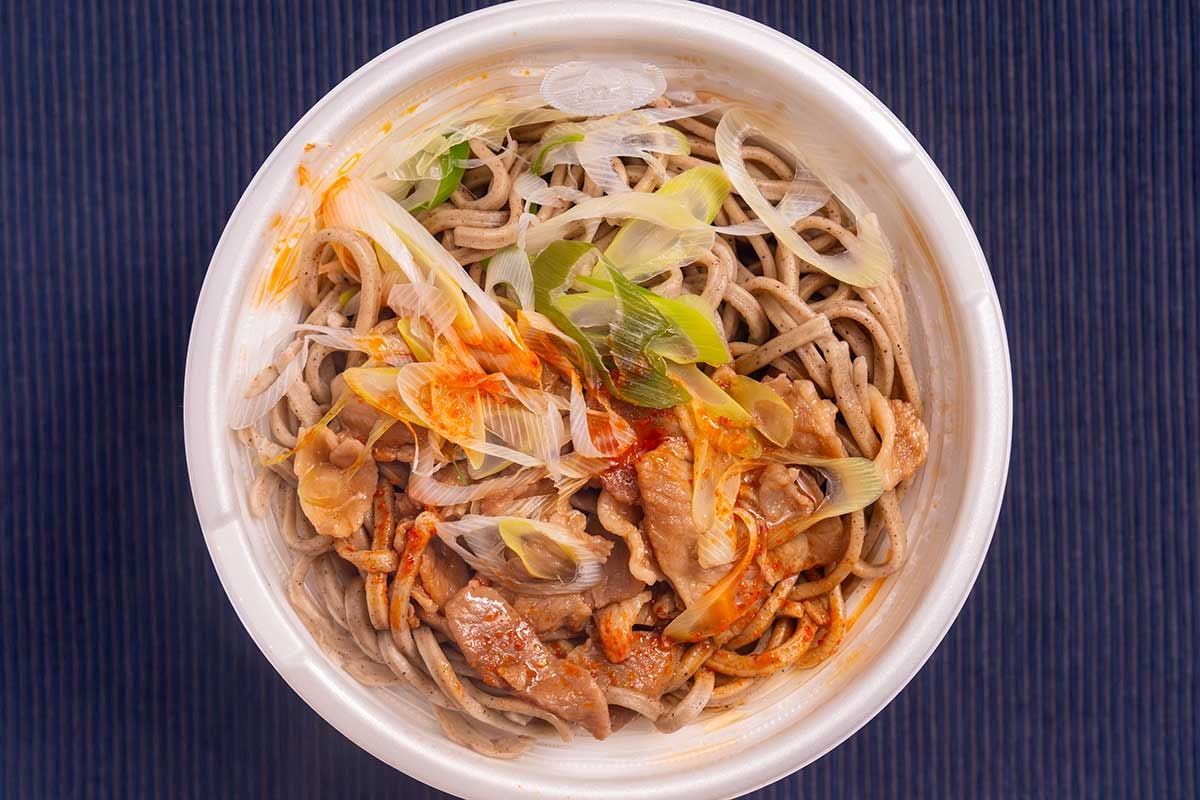本商品は、食べごたえのある太麺のそばに、甘辛く煮た豚肉とねぎを盛り付け、ラー油の辛みを加えた肉そばです。