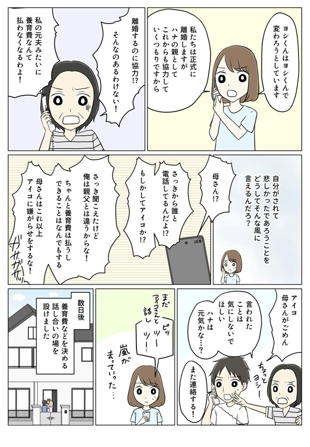離婚が決まり、ヨシはアイコと子どものためにきちんと養育費を支払うことを約束します。ヨシは自分の金銭感覚がアイコや家族を傷つけていたことに気づき、反省している様子です。しかし義母にはまだアイコの思いが伝わっていない様子。