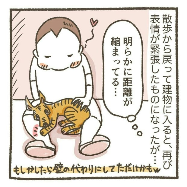 臆病で緊張していた犬でしたが、散歩になると明らかに表情が変わりましたね。施設に戻ったあとも、中村さんの息子さんに寄りかかっており、確実に距離が縮まったようです。