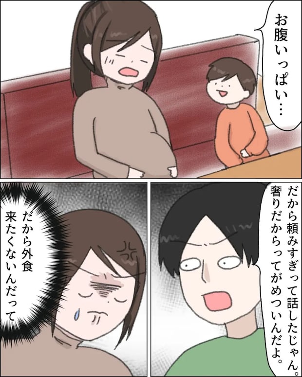 「お腹いっぱい・・」なんとか全部食べ切ったものの、お腹が苦しくてぐったりする私に「だから頼みすぎって話したじゃん。奢りだからってがめついんだよ」と文句タラタラ。無理して食べてこんな風に言われるなんて・・。だから外食来たくないんだって。私はイライラをグッと我慢しました。