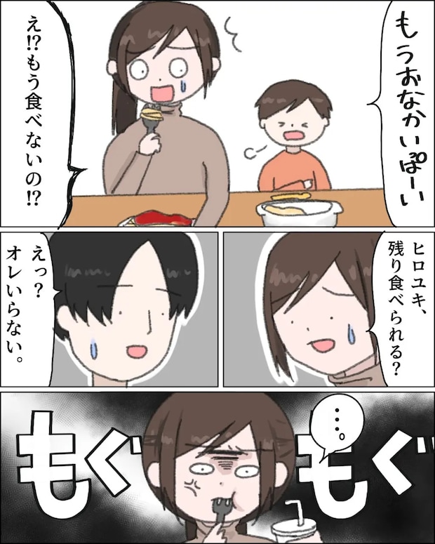 しかし・・。ミナトが早々に「もうおなかいっぱーい」と言い出し、グラタンを残しました。「ヒロユキ、残り食べられる?」と聞いてみるも「えっ?オレいらない」とあっさり断られ、私は無言で自分のパスタとミナトが残したグラタンを詰め込みました。