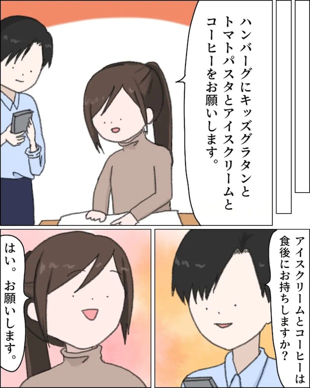 ヒロユキに何と思われようが、私は人数分の注文をすることを優先。「ハンバーグにキッズグラタンとトマトパスタとアイスクリームとコーヒーをお願いします」と伝え、アイスクリームとコーヒーは食後に持ってきてもらうことにしました。