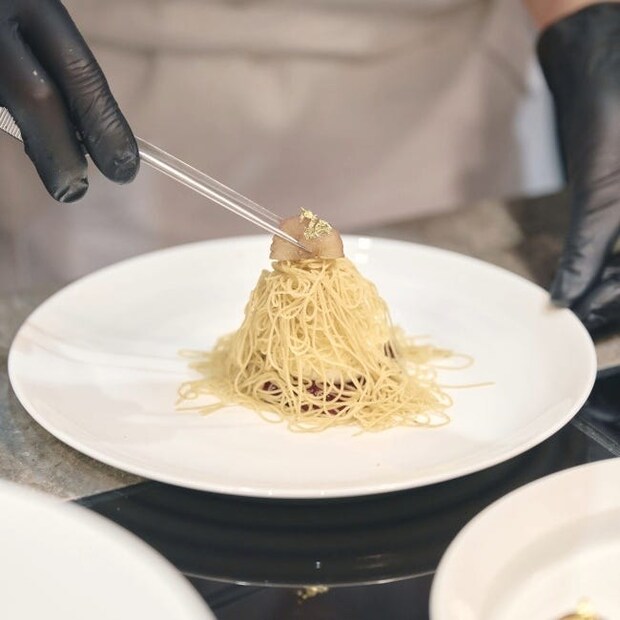 おすすめのメニューはまだまだ盛りだくさん。ライブステーションではクレープとモンブランが提供されるほか、「ミニブリオッシュクロスティーニ フォアグラムース、金箔フレーク」や「スモークサーモンミルフィーユ マスカルポーネ、ディル」など華やかに仕上げられたセイボリーも数種類ラインナップするので、好きなだけ召し上がれ。