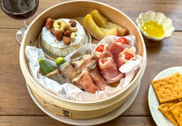 りんご蒸しはデザート感覚で味わえます。チーズとも相性がいいので、せいろ内で味の組み合わせも楽しめますよ。ワインが飲みたい日のせいろおつまみに!