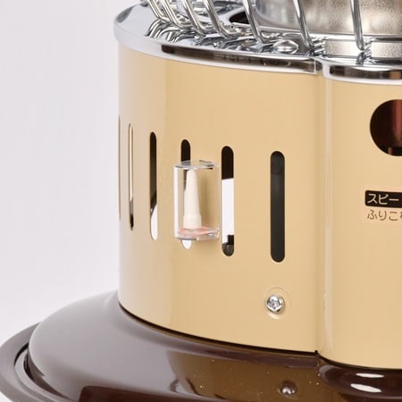 5周年記念モデル 小型対流形石油ストーブ「U-1417 キャプテンスタッグ×コロナ 石油ストーブ SZ-32CS-CT(ベージュ/ブラウン)」37,800円(税込)は、幅355mm×奥行355mm×高さ475mmで、約6.3kgとコンパクト。レトロなランタンを思わせる丸いフォルムで、ソロキャンプの前室やガレージ、ワークスペースなど限られたスペースでも使いやすいサイズ感だ。暖房の目安は木造9畳、コンクリート12畳程度。別売りの点火用ライターで点火する。