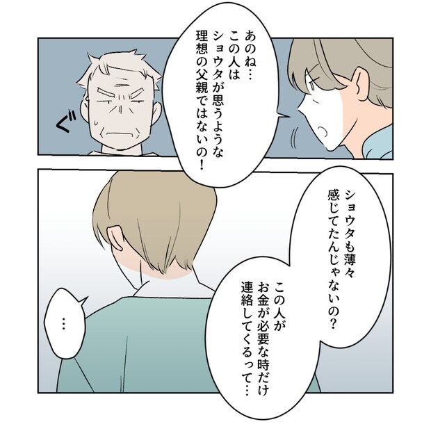 「あのね、この人はショウタが思うような理想の父親ではないの!」義母は義父を鋭くにらみつけながらそう言いました。義父もどこか思い当たるところがあるのか、口をグッとつぐみます。「ショウタも薄々感じてたんじゃないの?この人がお金が必要な時だけ連絡してくるって・・・」義母の言葉にショウタは何も言わず、ただ黙り込んでいました。