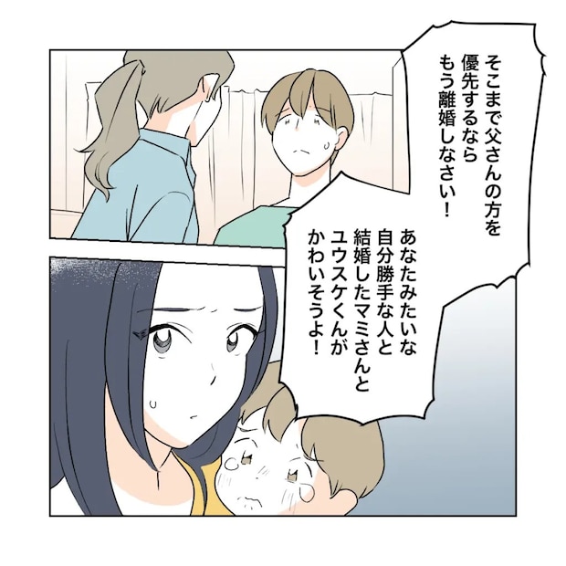 「そこまで父さんの方を優先するならもう離婚しなさい!あなたみたいな自分勝手な人と結婚したマミさんとユウスケくんがかわいそうよ!」義母はそう強く言い放ち、私とユウスケを庇ってくれました。ここまではっきりと言われて反論できなかったのか、ショウタは口を閉ざします。