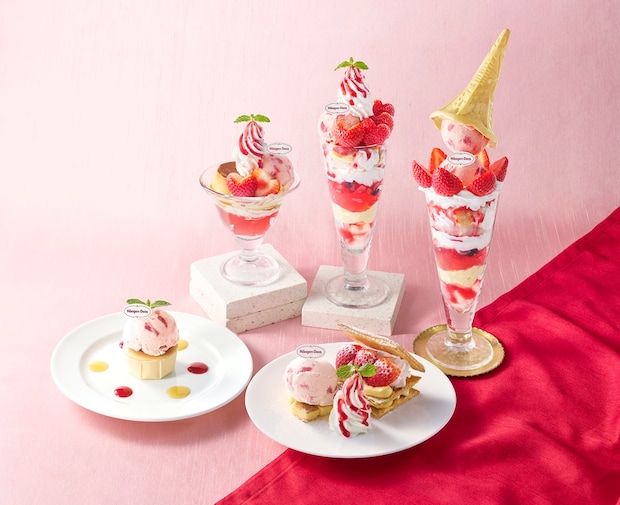 国産イチゴを組み合わせた高さ30センチメートル超のDXパフェ「ハーゲンダッツといちごのジョナパフェDX」などパフェ、サンデー、ミルフィーユなど全7種が揃う華やかなラインアップになる。