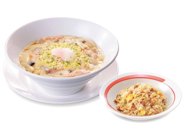 牛乳とチーズをたっぷり使った濃厚なカルボナーラソースと、中華そばの醤油スープを組み合わせた。具材には、玉ねぎ、ベーコン、マッシュルームなどを使用。食感や風味も味わえる商品に仕上げたとしている。温泉玉子添え。