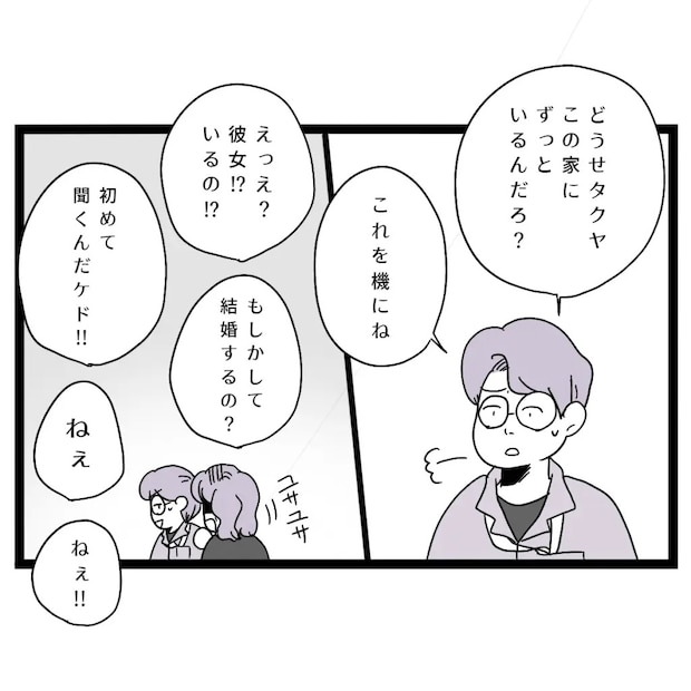 「どうせタクヤこの家にずっといるんだろ?これを機にね」弟を少し蔑むようなカズヤさんがそう言うと、「えっえっ?っ彼女!?いるの!?」と知らなかった重大ニュースに動揺した義母は、「もしかして結婚するの?」「初めて聞くんだけど!!」「ねぇ、ねえ!!」とカズヤさんの肩を掴んでユサユサと揺さぶりました。