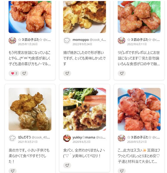 つくれぽ(つくりましたフォトレポートのこと)にも「いろんな食感がして美味しい」「何度もリピしています!」など、おいしくてたっぷり食べられるレシピが大絶賛されています。
