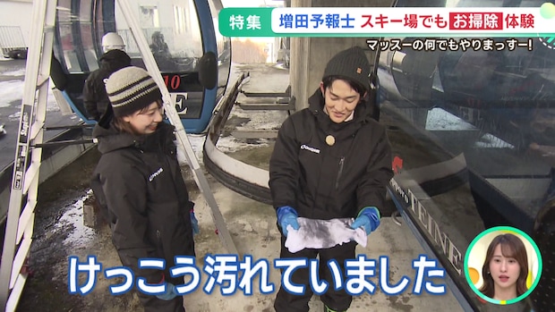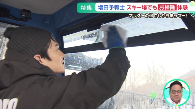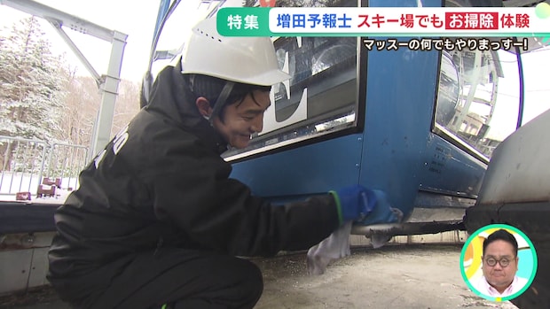 この専門的な解説には、日々天候と向き合うスキー場スタッフの中島さんも「さすがですね!」と感嘆。褒められてニッコニコになったマッスーは、その勢いでラストスパートをかけ、見事にゴンドラを磨き上げました。