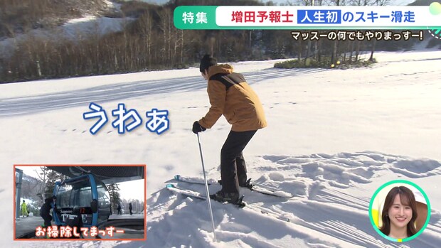 まるで漫画のように腹ばいで滑り落ちていく増田予報士。気象のプロも、雪山の重力には勝てなかったようです。