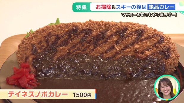 特徴はなんといっても、中央に鎮座する特大メンチカツ。その大きさはなんと22センチ! スノーボードに見立てたサクサクのメンチカツと、野菜やバターが溶け込んだ濃厚なルーの相性は抜群です。 「スキー場に来るとカレーが食べたくなりますよね~」と、マッスーも至福の表情で完食しました。