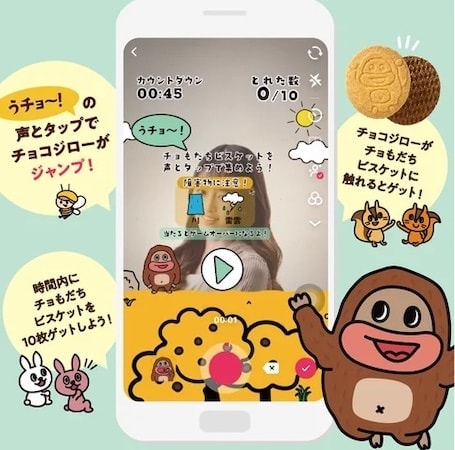 ほかにも、横スクロール型のTikTokゲームが登場。声かタップでチョコジローを操作して、チョもだちビスケットをゲットするゲームだ。