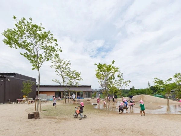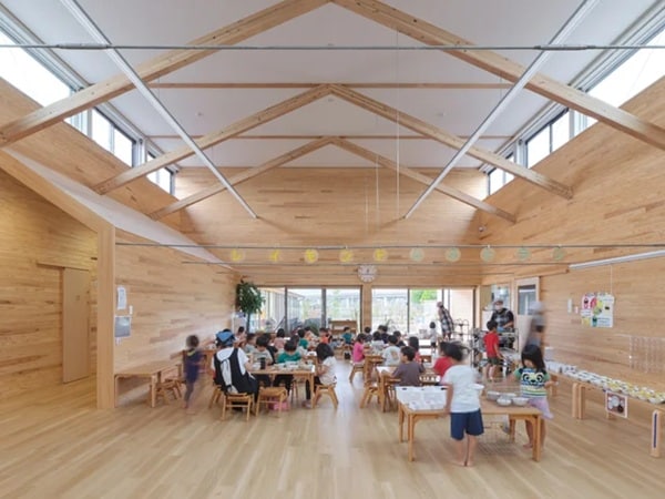 同じくキノアーキテクツが建築設計を手掛けた「レイモンド甲賀こども園」は、滋賀県の田園地帯に開園した定員200名の大規模園。軽やかな家型の木架構が園舎を横断し、屋内広場と保育室、ホールを連続させる。