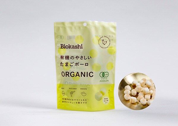 Biokashiとは、世界中から選び抜いた有機素材の美味しさを、ぎゅっと詰め込んだオーガニックのお菓子シリーズ。「Biokashi 有機のやさしいたまごボーロ」は、有機野菜のリアルな生産現場・実情と向き合い、行き場を失った有機じゃがいもからとれる有機でんぷんが活用されたお菓子だ。