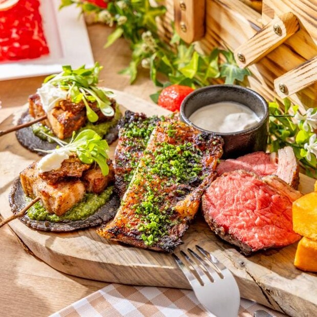 ミートアフタヌーンティーの主役である3種類の肉料理は、桜の薪を用い、燻味豊かに焼きあげてテーブルにお届け。