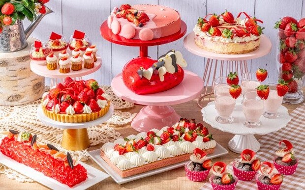大粒のいちごをたっぷりのせた「ストロベリータルト」やチーズとベリーの酸味が絶妙な「ストロベリーチーズケーキ」、そして桜の香りがほのかに漂うシフォン仕立てのスポンジにホワイトチョコレートクリームといちごを重ねた1品など、パティシエこだわりのストロベリースイーツが大集合。フレッシュいちごも1人1グラス用意されているので、いちご本来の味わいも存分に楽しもう。