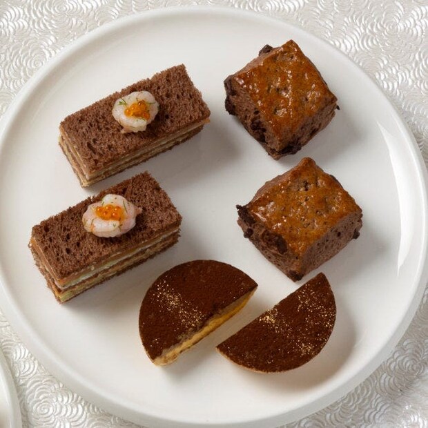 2段目は、カカオを用いたこだわりのメニューがラインナップ。チーズを効かせたアパレイユ(生地)にアシェパルマンティエ(※)を重ねて焼きあげた「キッシュパルマンティエ」、カカオパウダーを練り込んだパンを使用し、まるでチョコレートケーキ「オペラ」のような見た目に仕上げられた「サーモンのサンドイッチ オペラ風」といった、カカオを引き立たせたメニューが揃う。